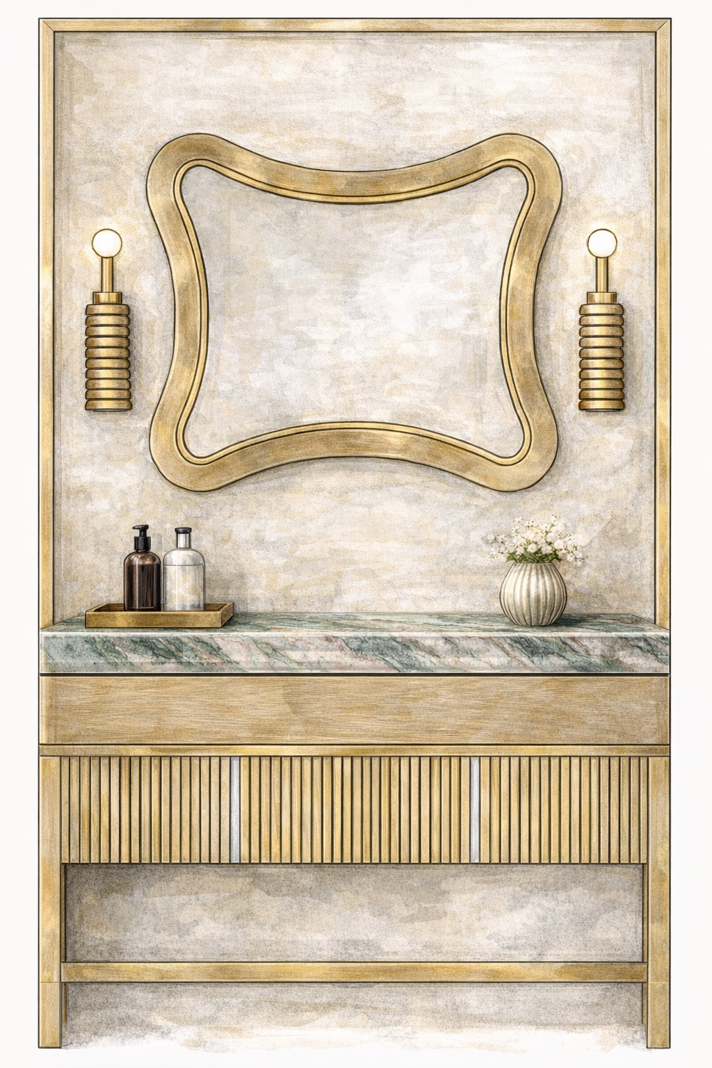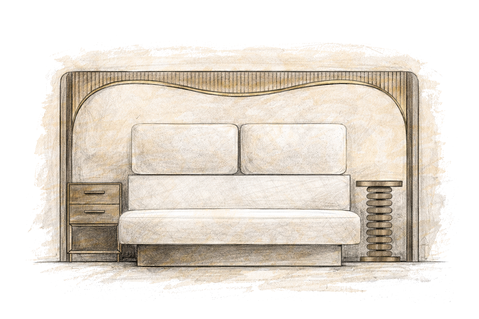 Throughout the collection, thoughtful layering of materials - warm wood tones, refined metals, tactile fabrics, and stone - creates depth and contrast. Subtle rhythm is introduced through repeating elements such as tambour detailing and soft curves inspired by the movement of waves, balancing structure with fluidity.